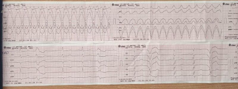 При огляді свідомість у жінки була порушена, ознаки шоку, на ЕКГ – пароксизм шлуночкової тахікардії. Лікарська бригада оперативно та злагоджено забезпечила внутрішньовенний доступ, кардіомоніторинг, здійснила знеболення та седацію. Після чого провела синхронізовану електричну кардіоверсію з розрядом 120Дж. Результат – відновлення синусового ритму. Жінку в стабільному стані доставили у відповідний заклад охорони здоров`я.