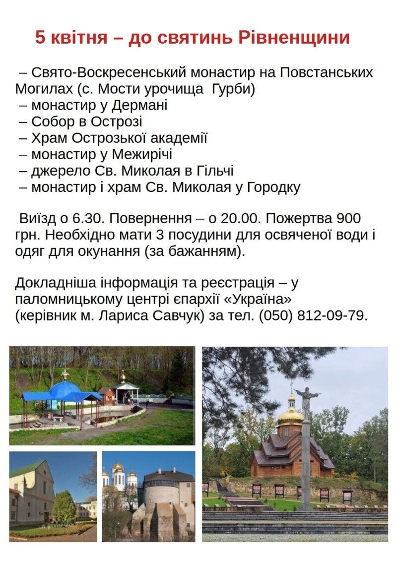 5 квітня – до святинь Рівненщини: Свято-Воскресенський монастир на Повстанських Могилах (с. Мости урочища Гурби), монастир у Дермані (п’ять чудотворних ікон і цілюще джерело) – собор в Острозі (мироточива ікона) – монастир у Межирічі (чудотворна ікона) – джерело Св. Миколая в Гільчі – монастир у Городку (чудотворна ікона, частинка гробу Пресвятої Богородиці). Виїзд о 6.30. Повернення – о 20.00. Пожертва 900 грн. Необхідно мати 3 посудини для освяченої води і одяг для окунання (за бажанням).
