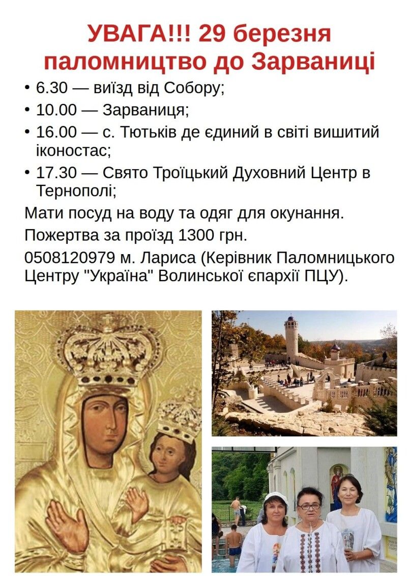 29 березня – до Зарваниці, Свято-Троїцького духовного центру в Тернополі та с. Тютьків (вишитий іконостас). Виїзд о 6.30. Необхідно мати посуд для освяченої води та одяг для окунання (за бажанням). Пожертва – 1300 грн.