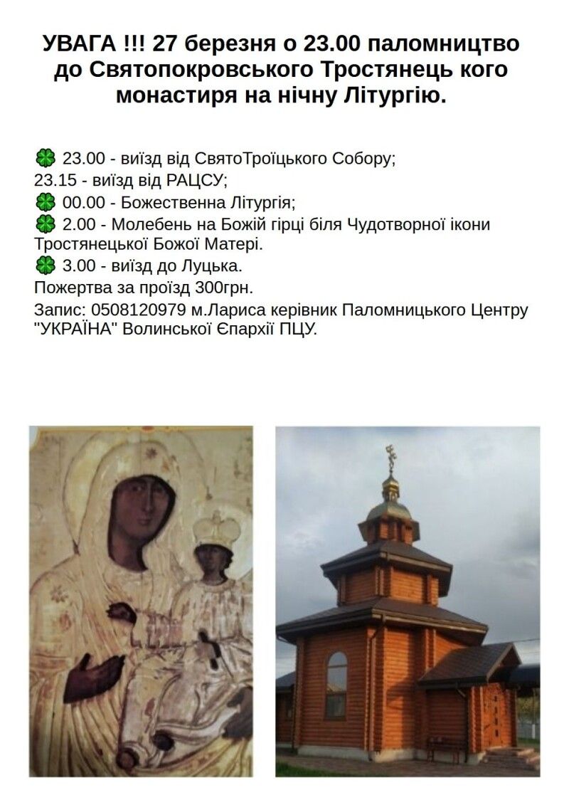 27 березня – на нічну літургію в жіночий монастир Покрови Пресвятої Богородиці в с. Тростянець Ківерецького деканату. Виїзд о 23.00 від Свято-Троїцького собору, 23:15 – від РАГСу. Пожертва 300 грн.