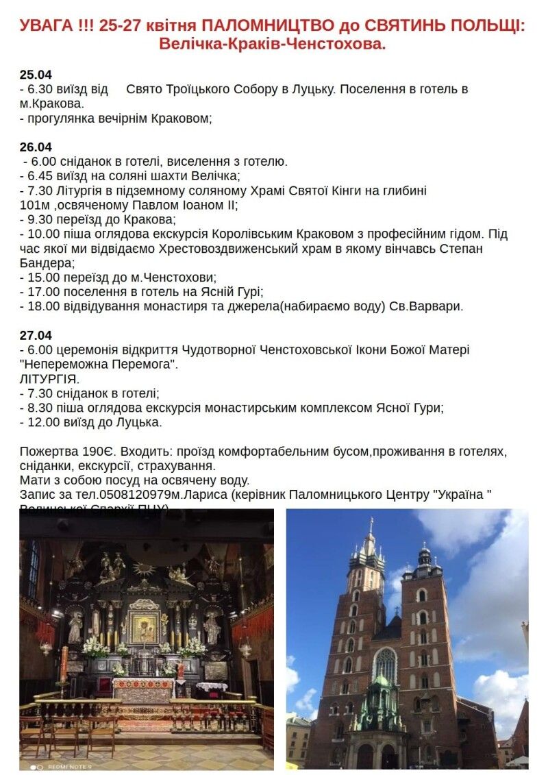 25 – 27 квітня – до святинь Польщі: Ченстохова, Краків. З відвідуванням підземного соляного храму на копальнях Велічка. Виїзд 25 квітня о 06.30 від собору. Пожертва – 190 євро.