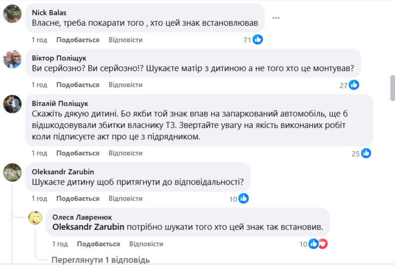 В коментарях до допису наголошують, що відповідальність має нести підрядник: «Шукайте підрядника, який встановлював знак. За таку якість робіт треба притягувати до відповідальності. Добре, що ніхто не постраждав».