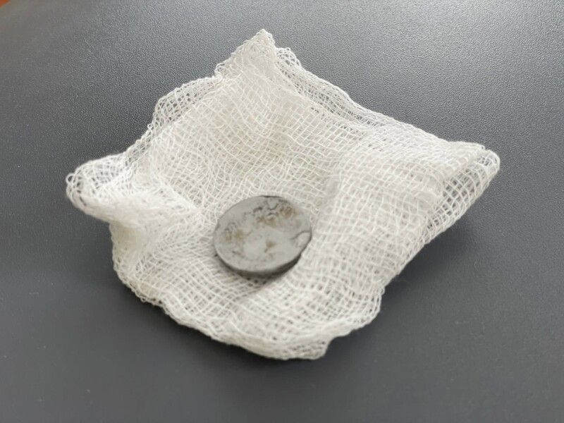 Вже під час ендоскопічного обстеження точно встановили, що ж це було. У ділянці першого фізіологічного звуження стравоходу міцно застрягла кругла літієва батарейка діаметром 2,5 см. Навколо неї сформувалися набряк та гіпергрануляції слизової оболонки — ознаки тривалого ушкодження тканин.