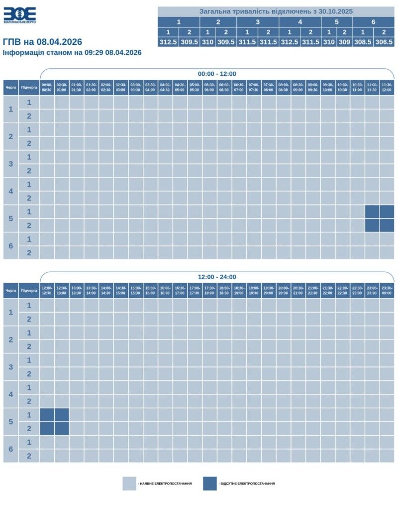 Час фактичного відключення та відновлення електропостачання може відрізнятися на 20–30 хвилин через технологічний процес перемикання черг.