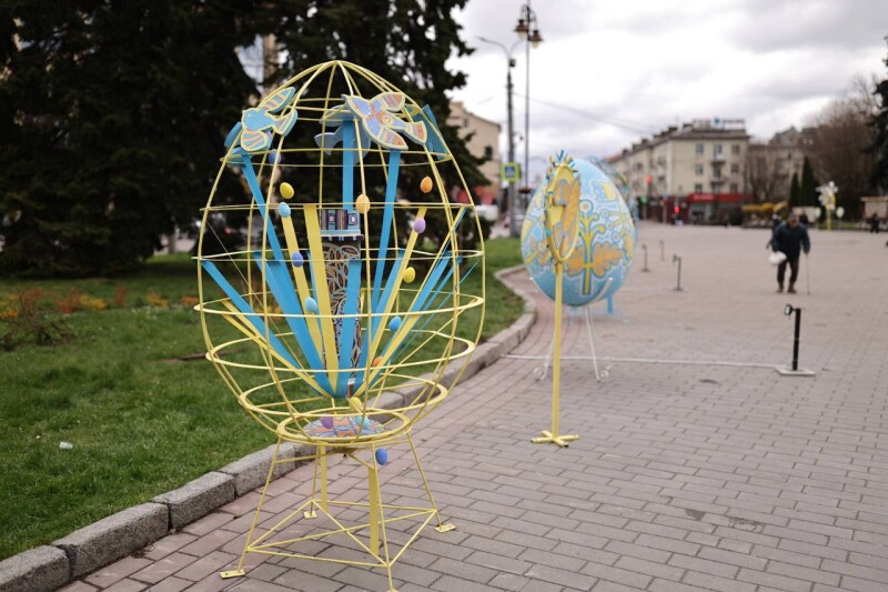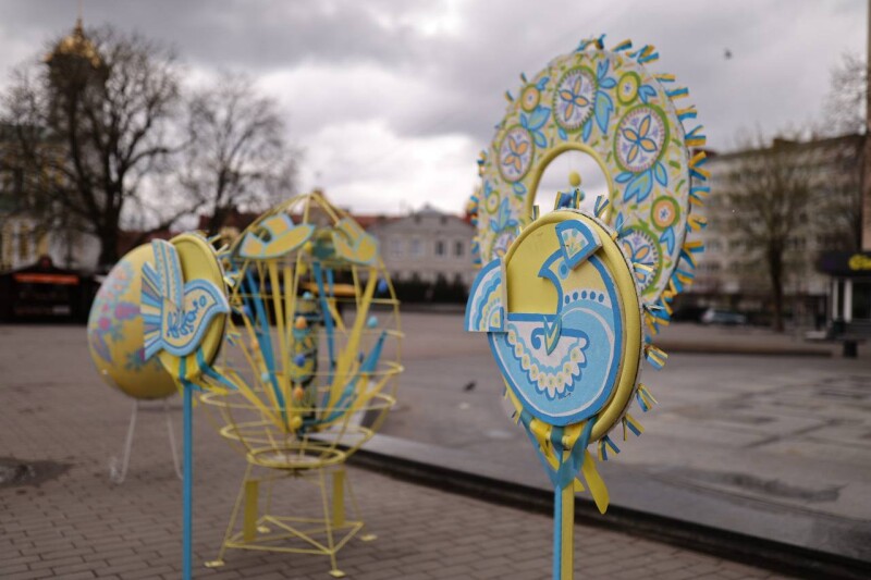 На Театральному майдані Луцька традиційно до Великодніх свят розгорнуто святкові артінсталяції, що формують у серці міста простір духовного оновлення, національної пам’яті та єдності громади.