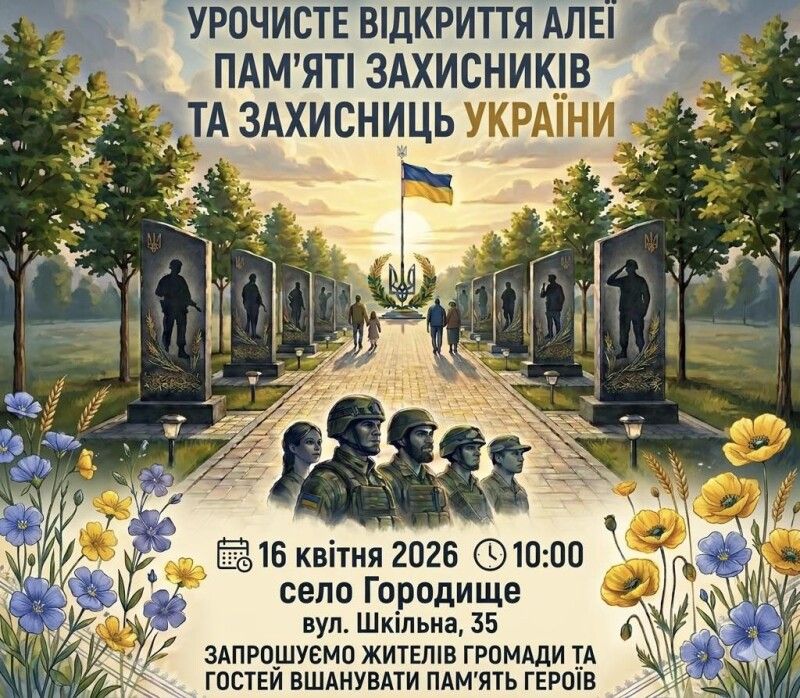Городищенська сільська рада запрошує жителів громади та гостей долучитися до важливої та зворушливої події — урочистого відкриття Алеї пам’яті Захисників та Захисниць України