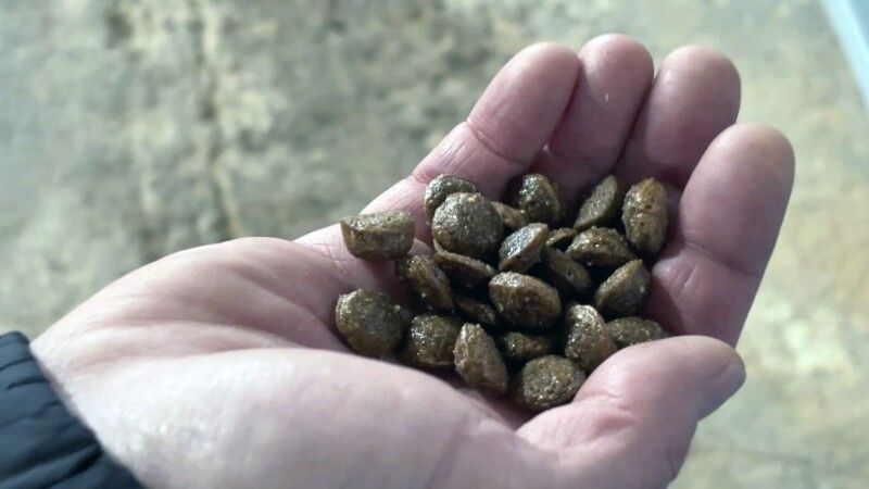 Зі слів підприємця, після сушильного барабана й калібратора виходить гранула, яка далі потрапляє в дражувальний барабан і напилюється курячий жир, лососева олія, гідролізат печінки.