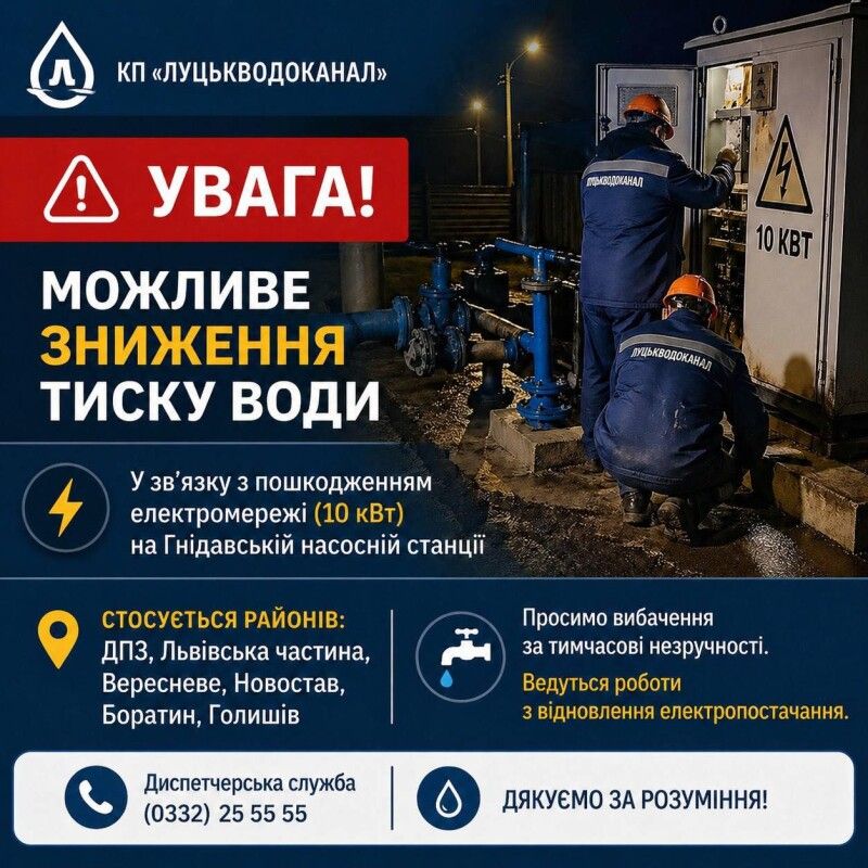 Як повідомили у КП «Луцькводоканал», через технічну несправність на станції можливе суттєве зниження тиску води.