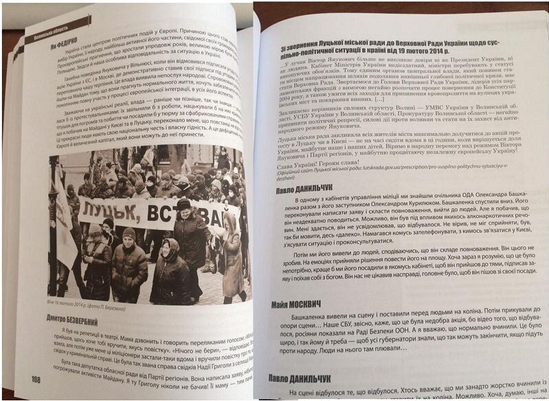 «Наше нове видання, ще тепленьке, - повідомила на своїй сторінці у «Фейсбуці» перший заступни к голови Інституту національної пам’яті, лучанка Аліна Шпак. – Про Майдан – в глобальному сенсі. Про все, що відбувалось в регіонах гарячої зими 2013-2014 року. Наразі перший том. Особливо приємно, бо там моя рідна Волинь і багато знайомих облич, друзів, якими пишаюсь», – зазначила вона.