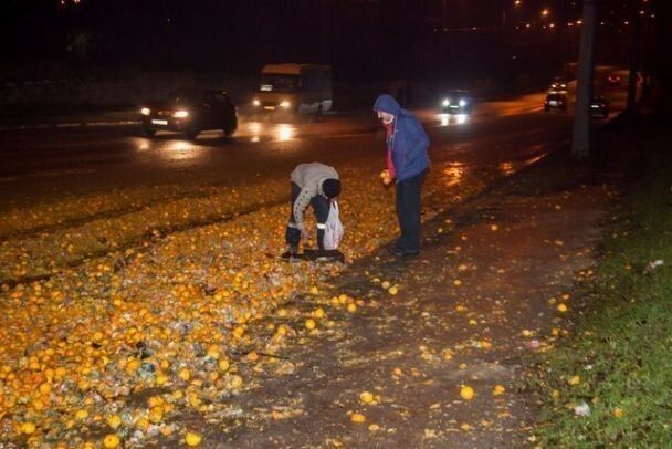На виклик приїхали патрульні. Вони з’ясовували, як мандарини випали з вантажівки. Цитрусових було так багато, що для прибирання дороги викликали комунальний трактор і машину для чистки асфальту.