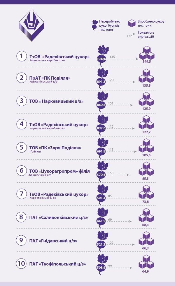 «Сумарно, 70,8% загальної кількості цукру виробили 20 цукрових заводів. Окрім того, інтегровані компанії, які за останні роки сформувалися у бурякоцукровій галузі Україні, у 2017/2018 сезоні переробки виробили 69,5 % цукру від загального виробництва. Так, наприклад, ТОВ «Астарта-Київ» і цьогоріч закріпила за собою позицію лідера цукрового ринку виготовивши 462,9 тис. т цукру, що становить 23% від загального виробництва. На друге місце піднялись ТзОВ «Радехівський цукор», який зумів наростити показники порівняно з минулим роком за рахунок запуску придбаних раніше цукрових заводів, що належали ТОВ «Галичина-цукор» - 433,1 тис. т, що становить 21% від загального виробництва. Третє місце – ЗАТ «Укрпромінвестагро», два цукрові заводи якого виготовили 241,3 тис. т цукру, що становить 12% від загального виробництва», - прокоментувала Руслана Бутило, керівник аналітичного відділу НАЦУ «Укрцукор».
